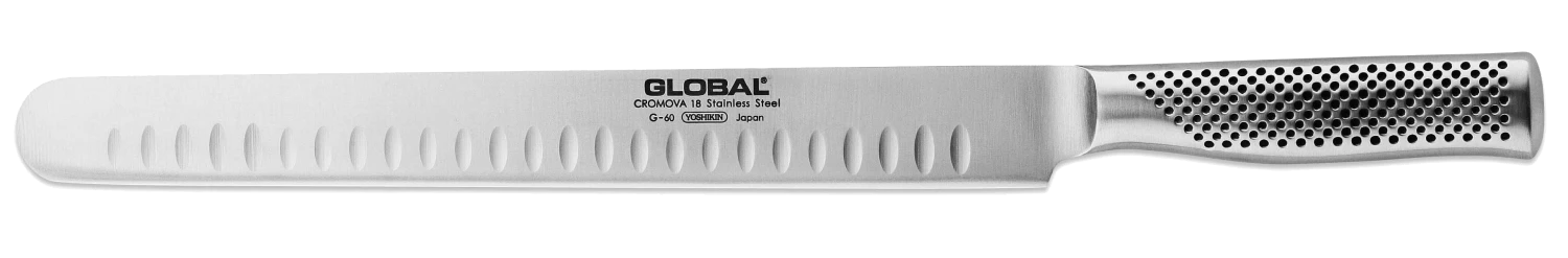 The Global G60 – 30cm Fluted Ham Slicer is a stainless steel hand wash only slicer. It is 27 cm long, which will yield a perfect roast size for dinner.
