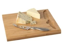 The cutting board is made from bamboo and has a cutout for safe storage of the knives when not in use, while the Global 10.5cm cheese knife provides you with a universal cheese knife that is easy to clean and durable enough for any occasion.