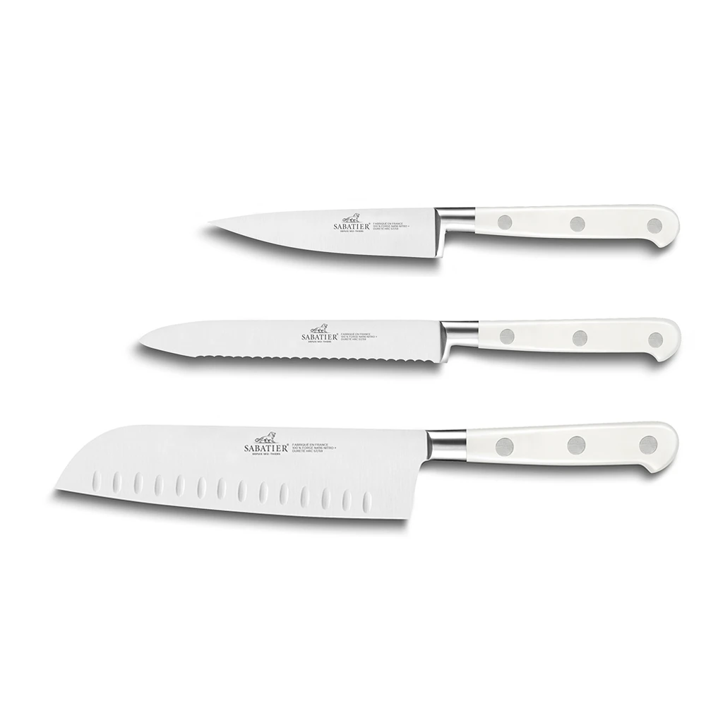 The Ideal Cuisine set is part of the Ideal collection from the signature brand Lion Sabatier®. This set is composed of a 18cm Santoku Knife, honeycomb blade for cutting, slicing raw food, 10cm Paring Knife with a sharp tip and a rigid blade for peeling, deseeding and easily carrying out all precision tasks and a 12cm Serrated Utility Knife, serrated blade for peeling, cutting and preparing hard-skinned fruits and vegetables