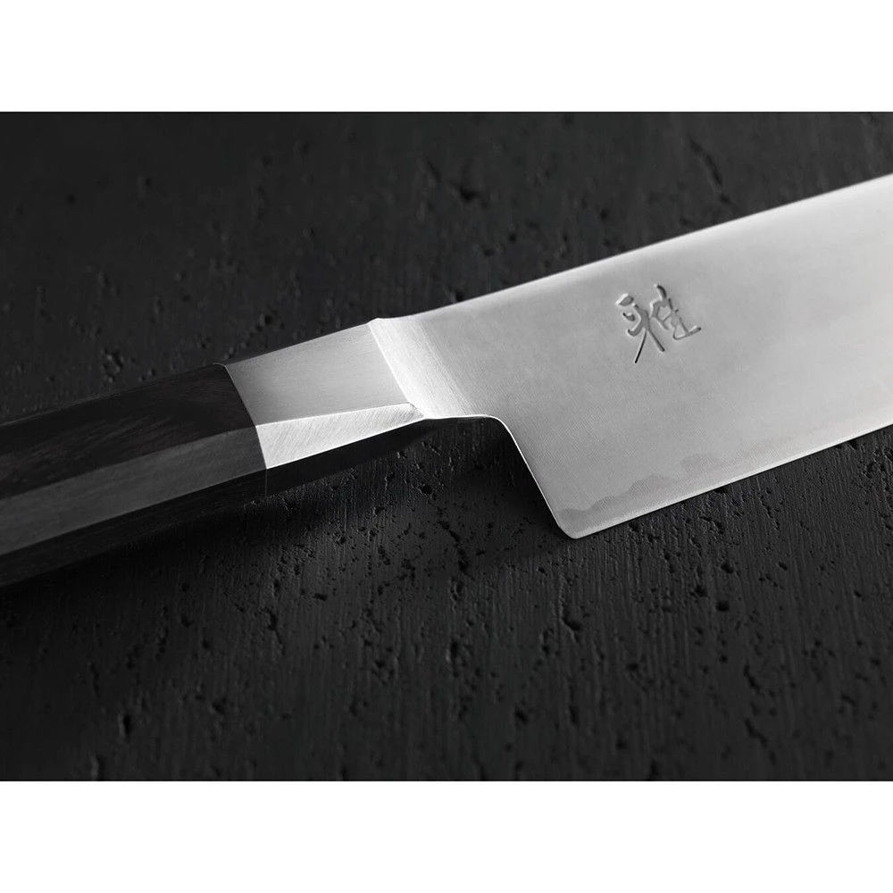 The Miyabi logo is engraved on the blade and it has a masterful Katana-edge cut of great sharpness and edge holding ability.