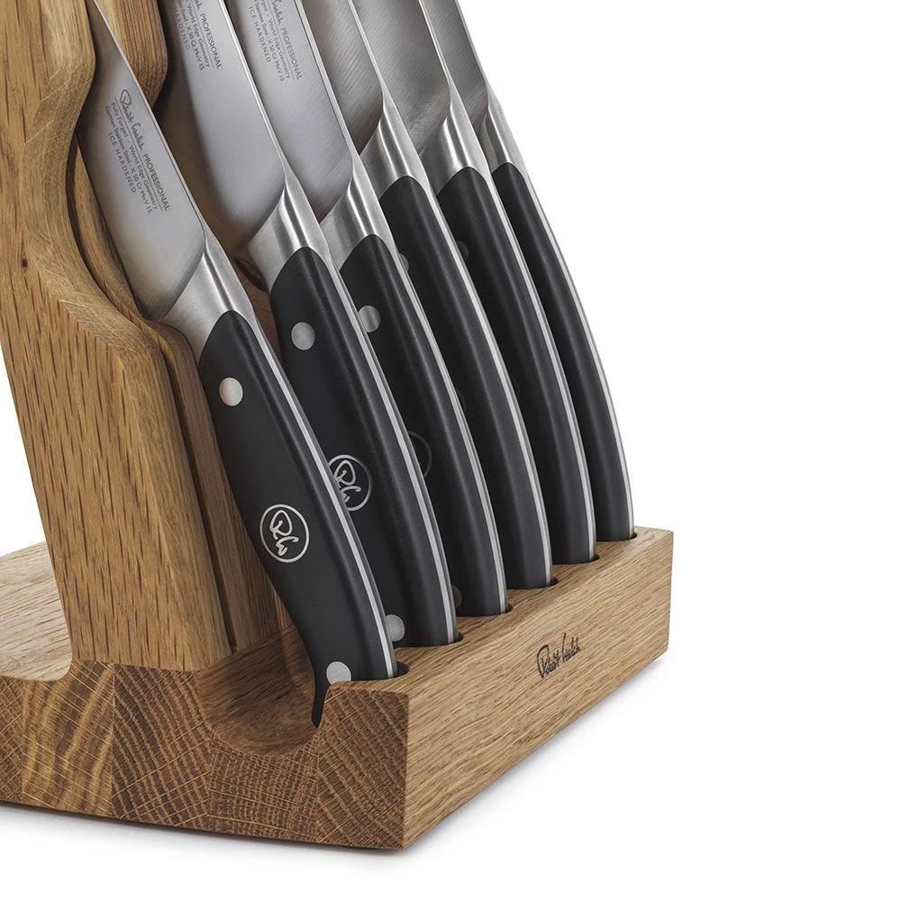 The following knives and accessories come with this set: Angle Oak Knife Block (1), Professional Carving Knife, 22cm (1), Professional Bread Knife, 22cm (1), Professional Chef’s Knife, 18cm (1), Professional Santoku Knife, 14cm (1), Professional Kitchen Knife, 14cm (1), Professional Paring Knife, 9cm (1)