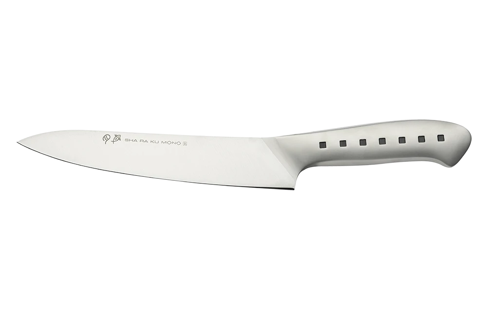 The knives feature an elegant and stylish sweeping design evoking the history of the traditional Samurai katana sword. The handles of the knives are made from stainless steel and are hollow, making these knives feel extremely light. Tojiro Sha Ra Ku Mono knives are good value for a range of high carbon Japanese steel knives and have a hardness of 56 HRC.