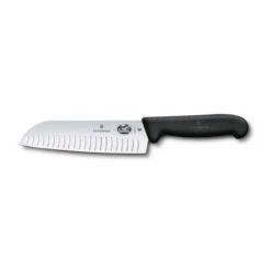 Cut through anything with Swiss-made Victorinox Fibrox 17cm Santoku Knife Fluted. The non-slip, ergonomic handle is comfortable to hold and the blade is sharp and durable for a wide range of tasks. The fluted edge makes it easy to slice through food with precision.