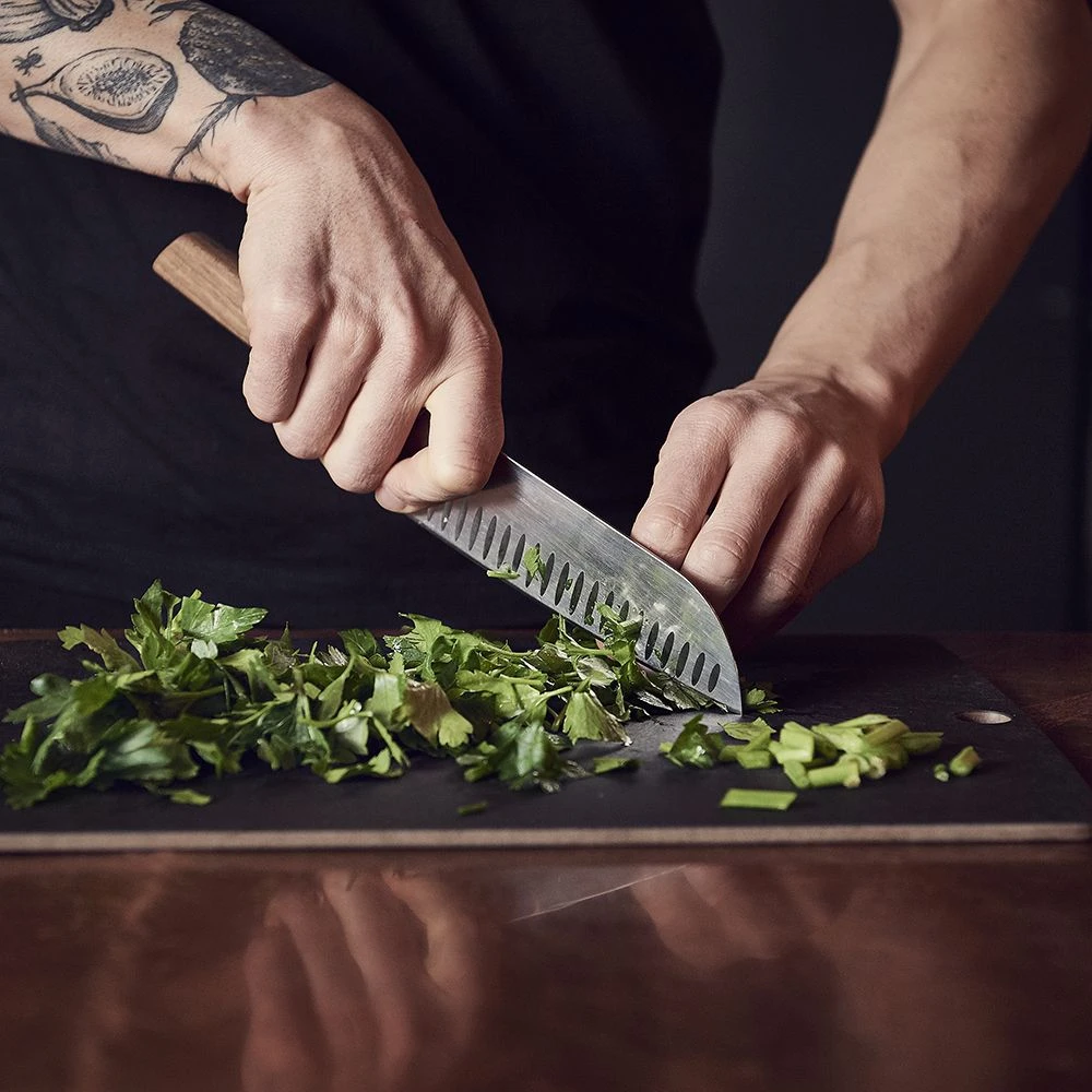 The handles are made of European walnut – richly grained, dark-brown wood, making each knife genuinely unique. And something else puts Swiss Modern knives in a class of their own – the walnut, which feels unbelievably warm and natural. The geometrically shaped handles create a dynamic impact and give mankind’s oldest and most important tool a contemporary feel. This Santoku knife is about the perfect balance of elegance and functionality, durability and timelessness.