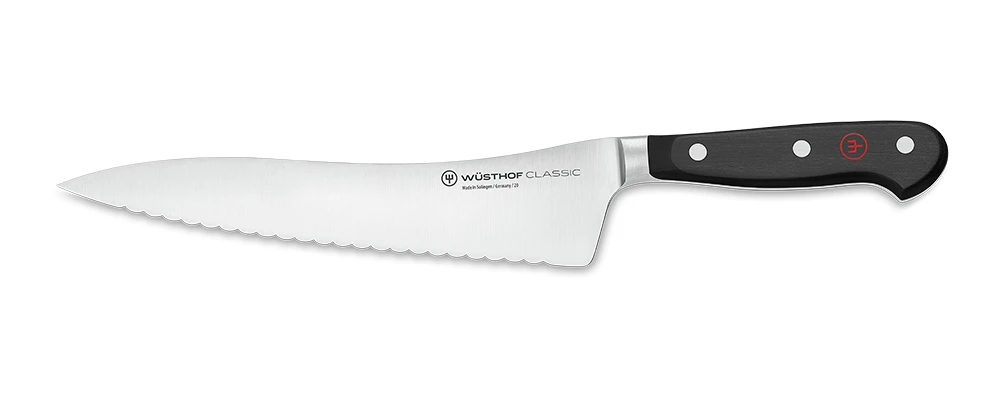 The knife with an offset handle to provide ample clearance between the knuckles and the cutting board whilst slicing baguettes or cutting sandwiches.