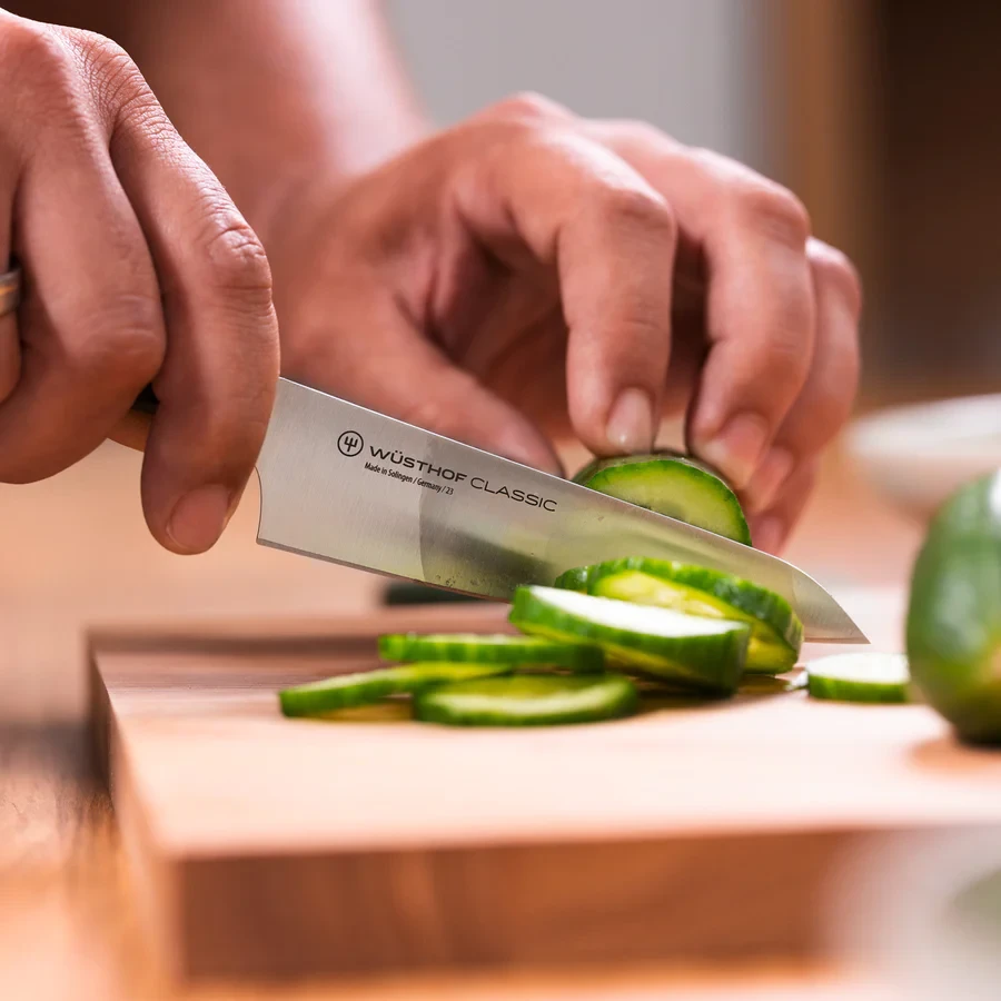 This Wusthof Classic Asian Utility Knife features a uniquely curved straight-edge blade that works for low rocking cuts requiring moderate heft and precise balance, as well as for closer hand work that demands a razor-sharp edge and outstanding agility. It’s the ideal size and shape for numerous food prep tasks and ingredients, including small- and medium-sized fruits, vegetables, and cheeses. It’s also handy for trimming meats and poultry.