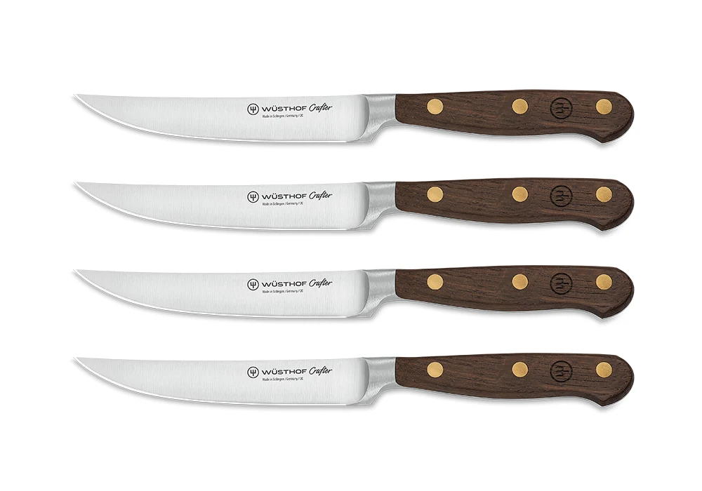This Steak Knife Set comes from the Wusthof Crafter collection. From cutting ability to blade-to-handle balance, no detail has been ignored. Triple brass rivets and full tang provide high durability and control. The smoked oak handles are branded with the Wusthof logo and are comfortable to hold. Set of 4.