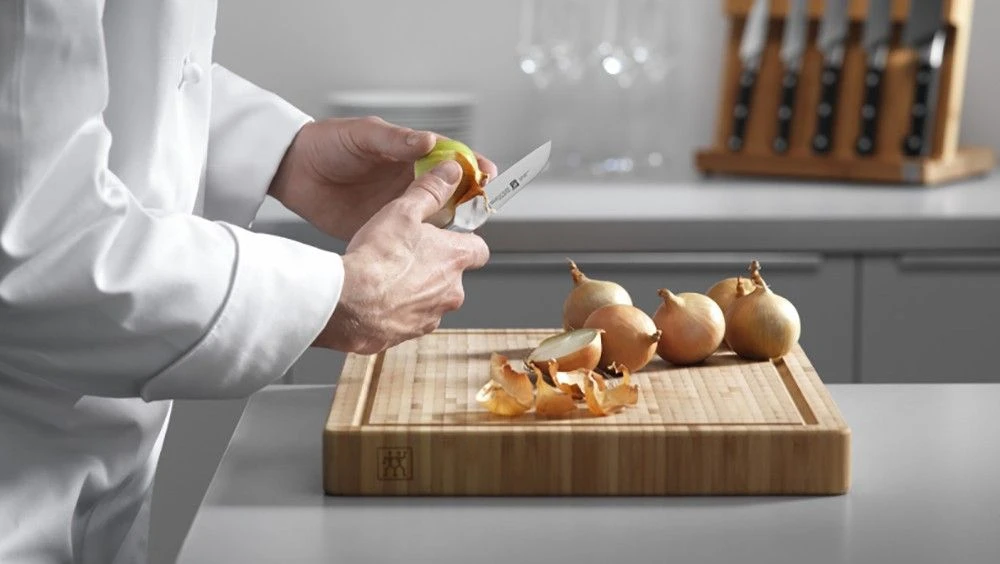 The vegetable knife from the ZWILLING® Pro range is an excellent choice for peeling, cutting or garnishing vegetables. With a blade length of 9cm and a straight, continuous cutting edge, it is ideal for cutting techniques typically used when preparing vegetables. Slice tomatoes or cut carrots into thin Julienne strips effortlessly with this knife. The sharp blade achieves a clean cut even on soft vegetables. Harder varieties can be chopped effortlessly. You can also cut vegetables into decorative garnishes, like cucumber fans, radish flowers or tomato baskets.